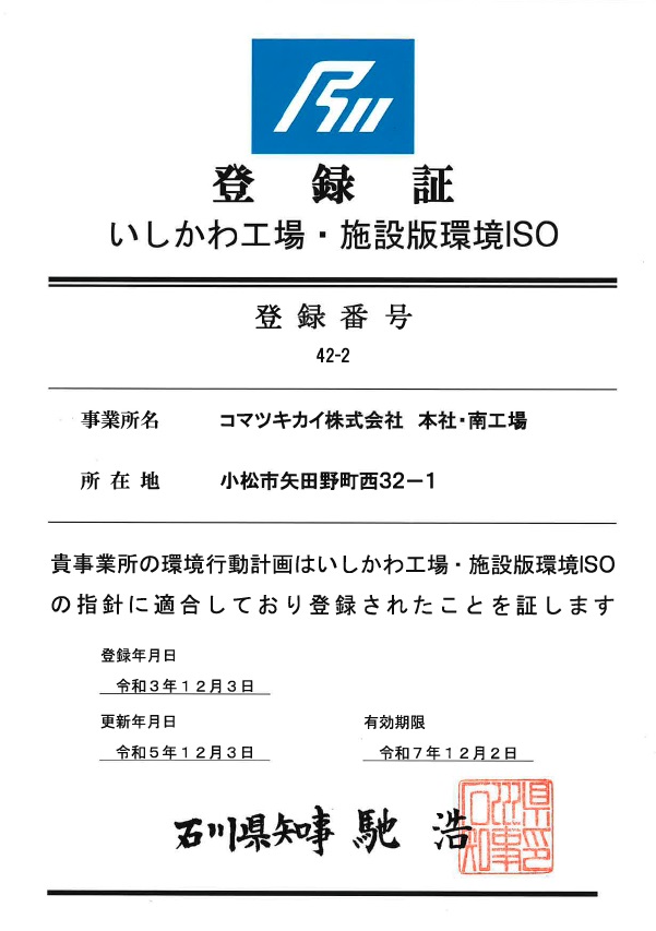 石川県独自で運用する環境マネジメントシステム「いしかわ工場・施設版環境ISO」に本社・南工場を登録し、自主的・積極的に省エネ等の環境保全活動に取り組んでおります。