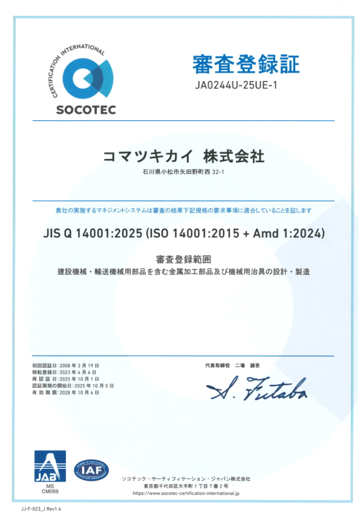 コマツキカイ株式会社は、環境基本方針に基づき、環境マネジメント活動を最重要課題の一つとして掲げ、次の事項を実行する。