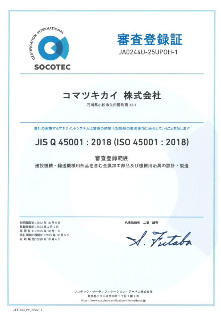 コマツキカイ株式会社は労働安全衛生マネジメントシステムに基づく活動に全従業員が参画し、安全と健康の維持確保は事業活動・企業存続における最重要基盤であることを認識し、「安全第一」「健康一番」の精神に徹し、安全で快適な職場づくりを目指します。